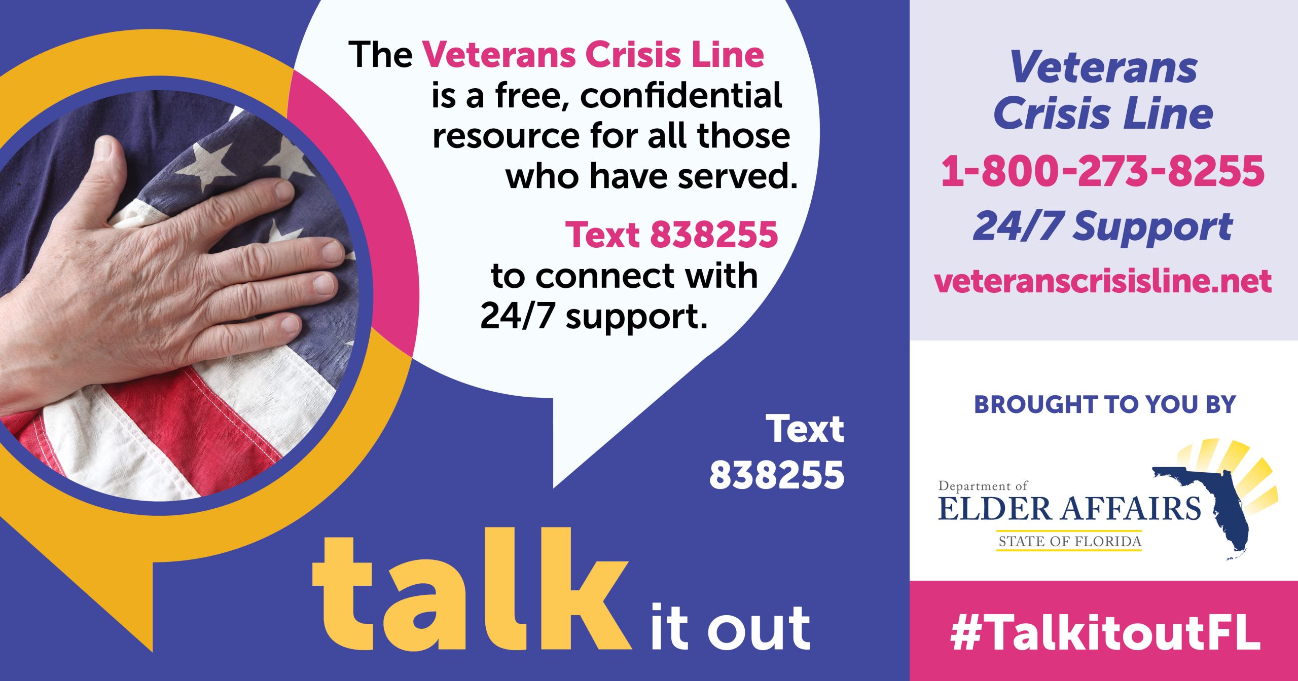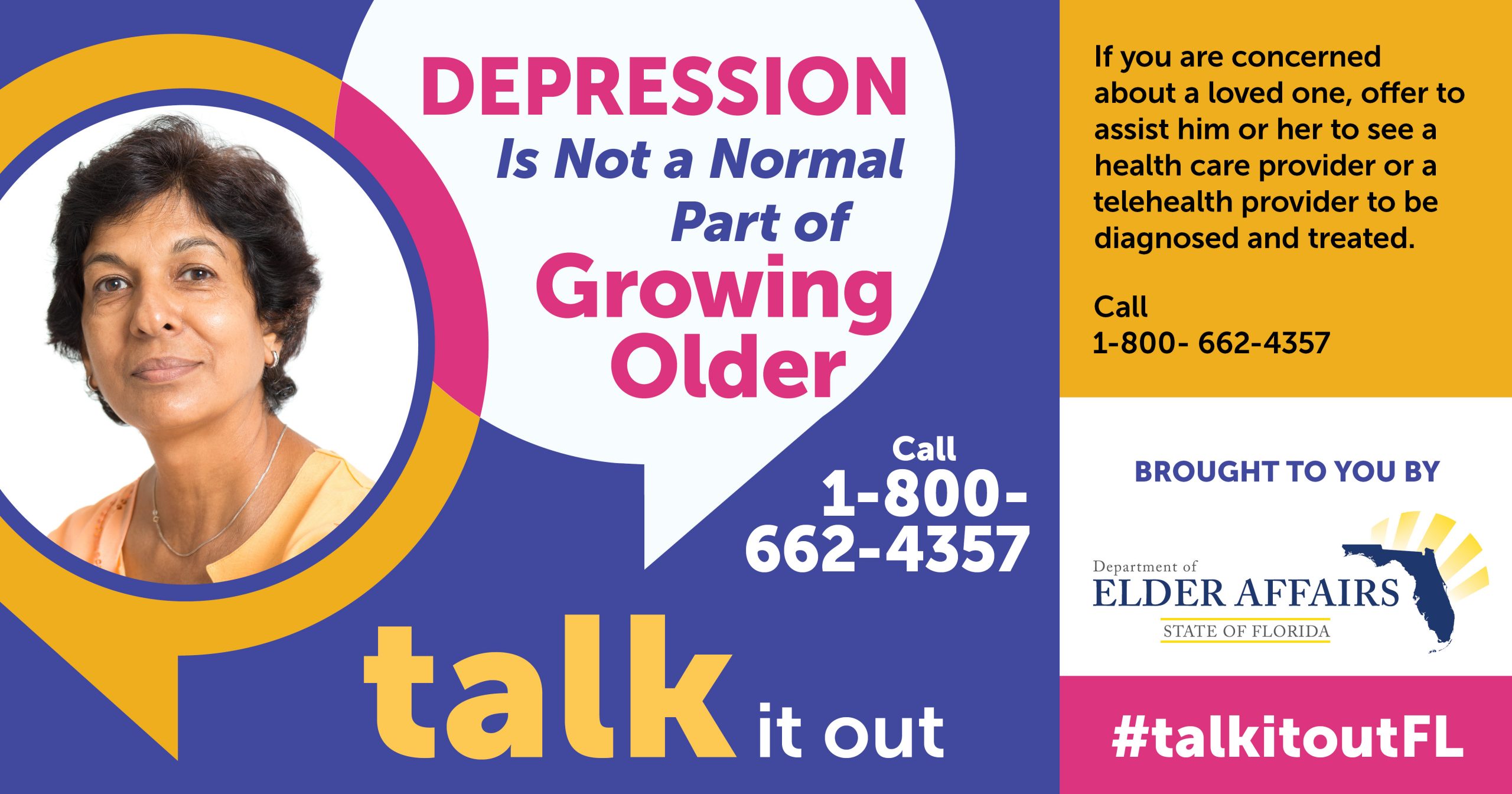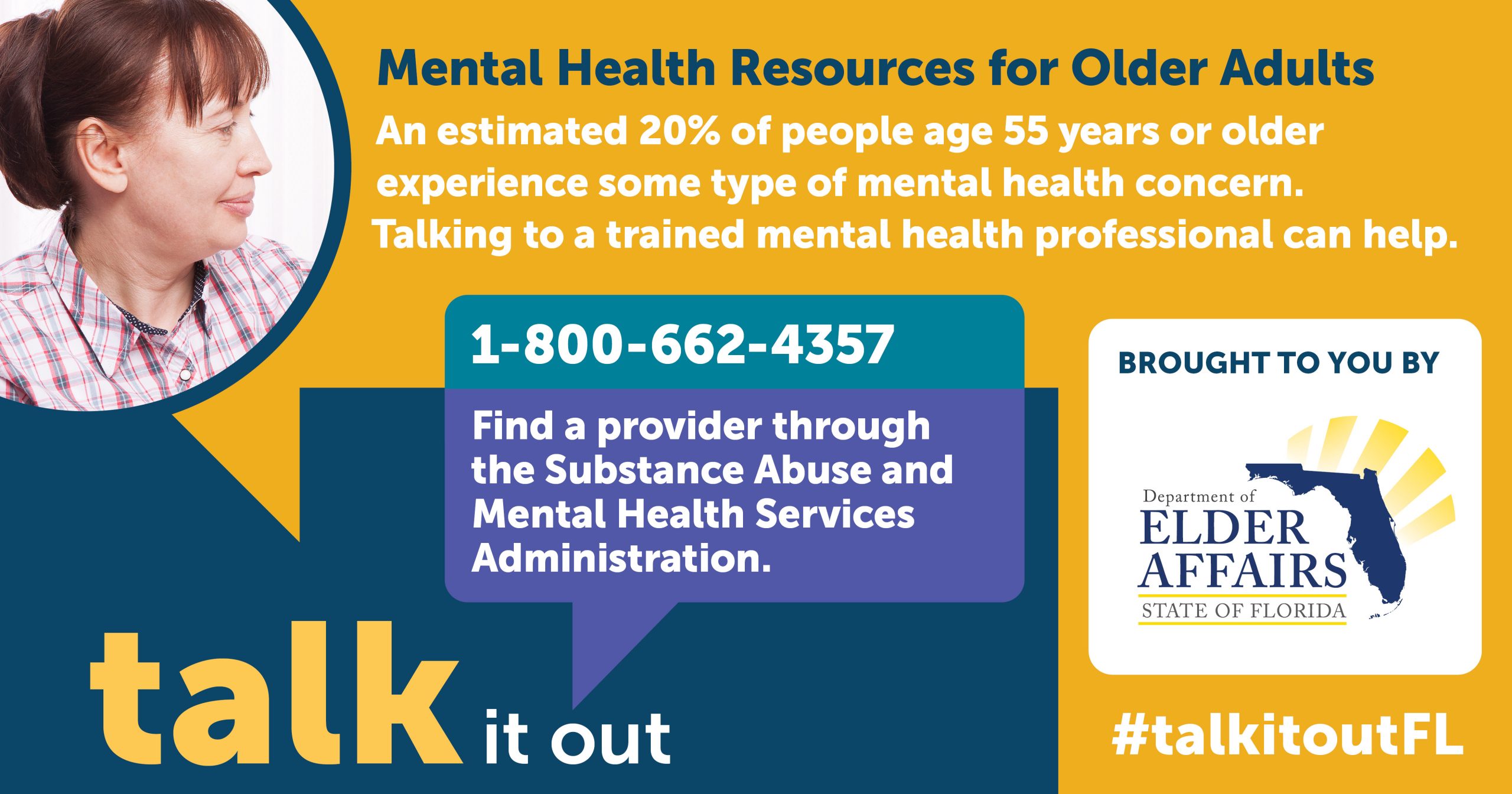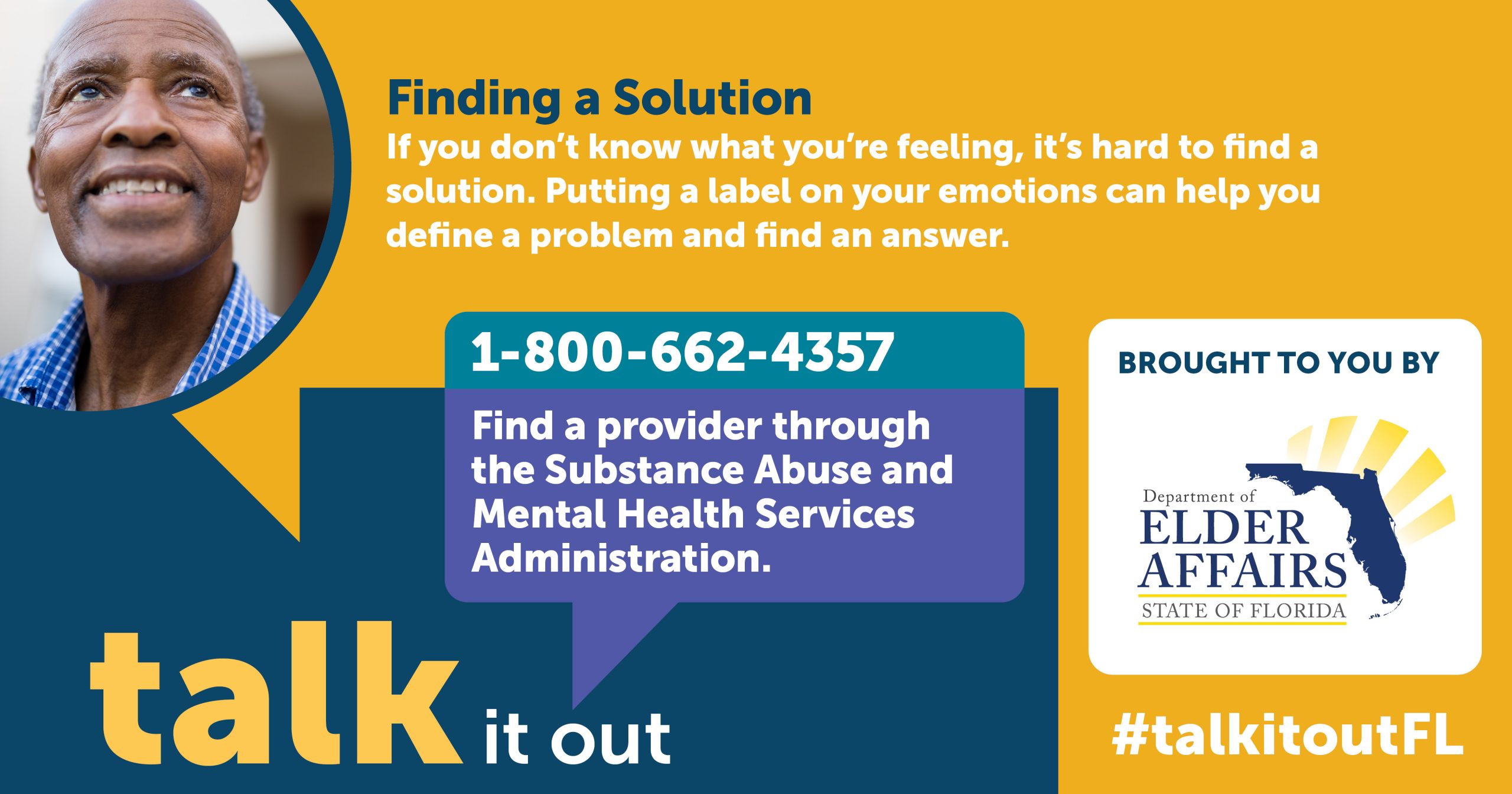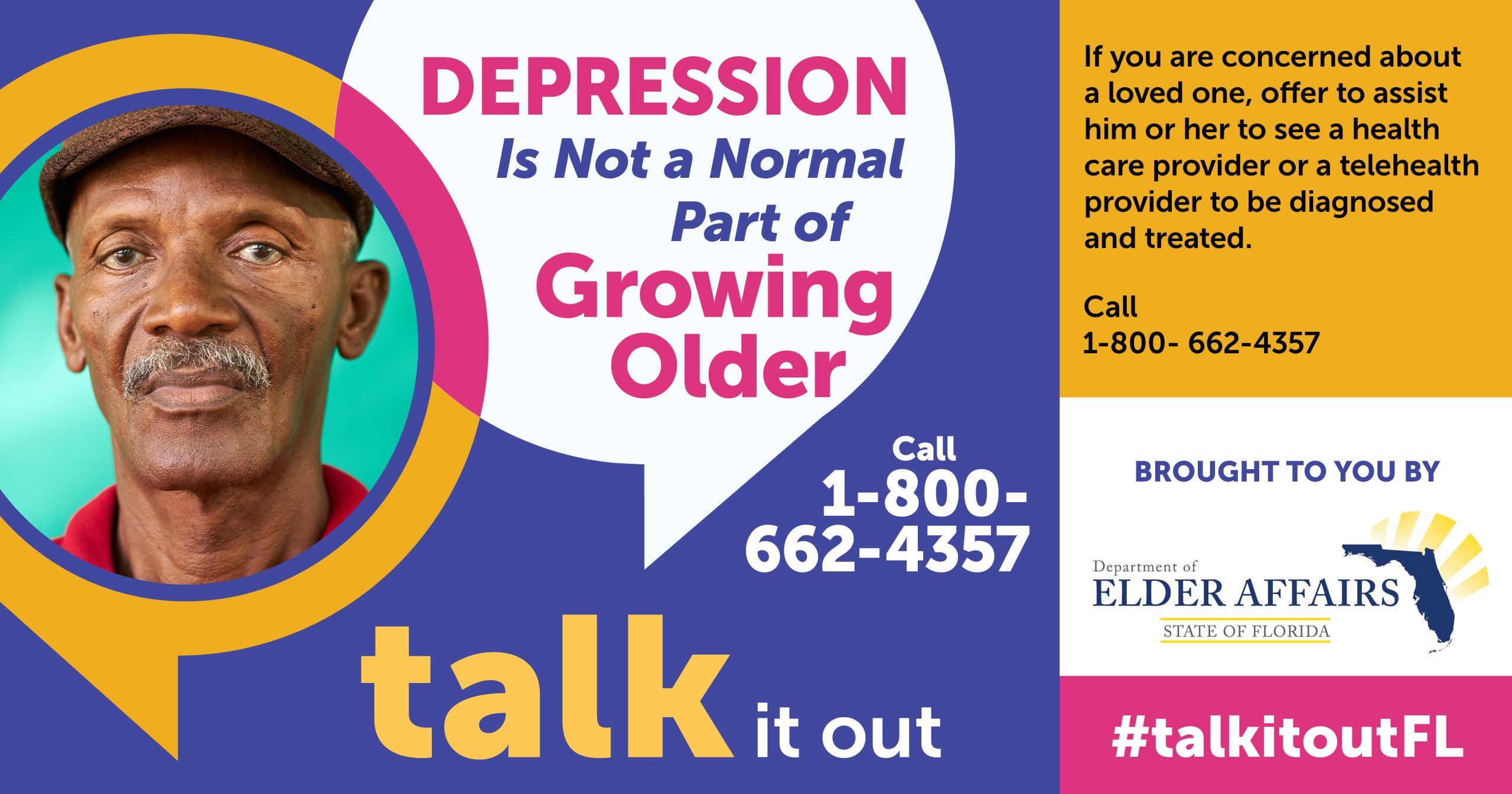 DOEA created mental health messaging through the Talk It Out Campaign and placed flyers in the bags of home-delivered meals. Social networking reiterated the fact that depression is not a normal part of growing older and listed numerous resources at #TalkItOutFL.